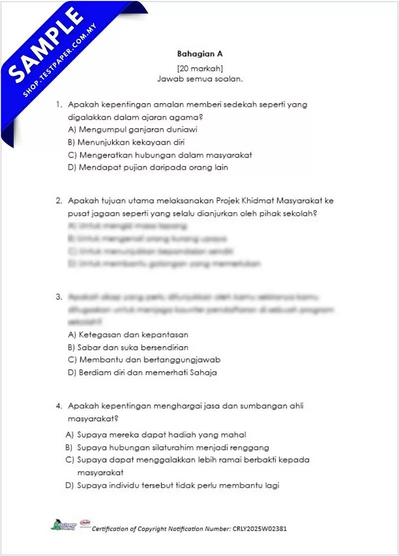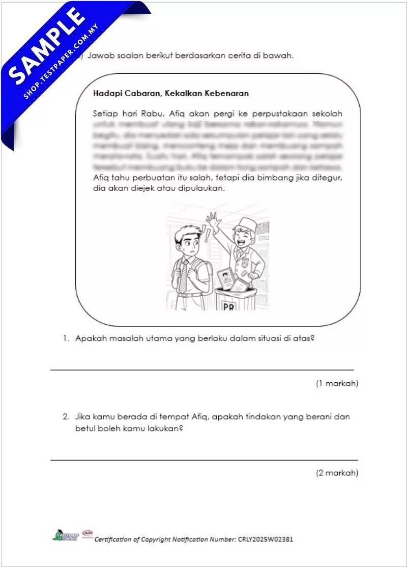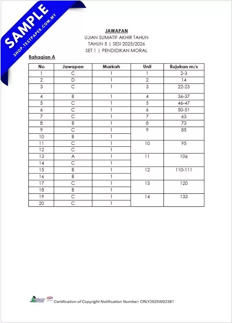 Dalam mendapatkan bahan rujukan yang berkualiti, pengguna diberikan pilihan yang memudahkan mereka mengikut keperluan masing-masing. Modul Pendidikan Moral Tahun 5 2025 ini bukan sekadar mengandungi soalan dan jawapan, malah turut menyediakan JSU yang menjadi panduan analisis pembinaan item. Dengan adanya jadual spesifikasi, guru boleh memahami peratusan aras kesukaran, topik, serta kemahiran yang diuji, sekali gus menjadikan pentaksiran lebih berfokus dan terancang.